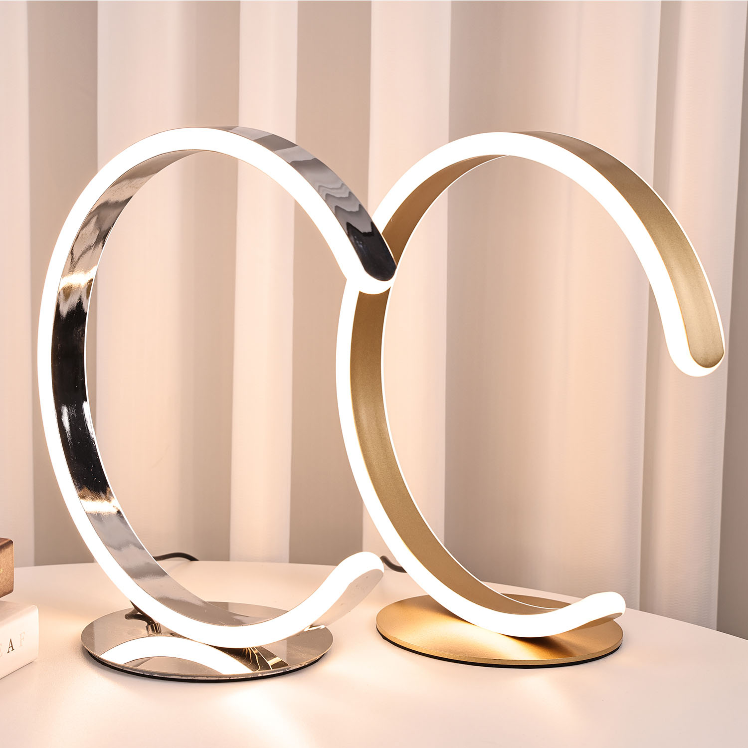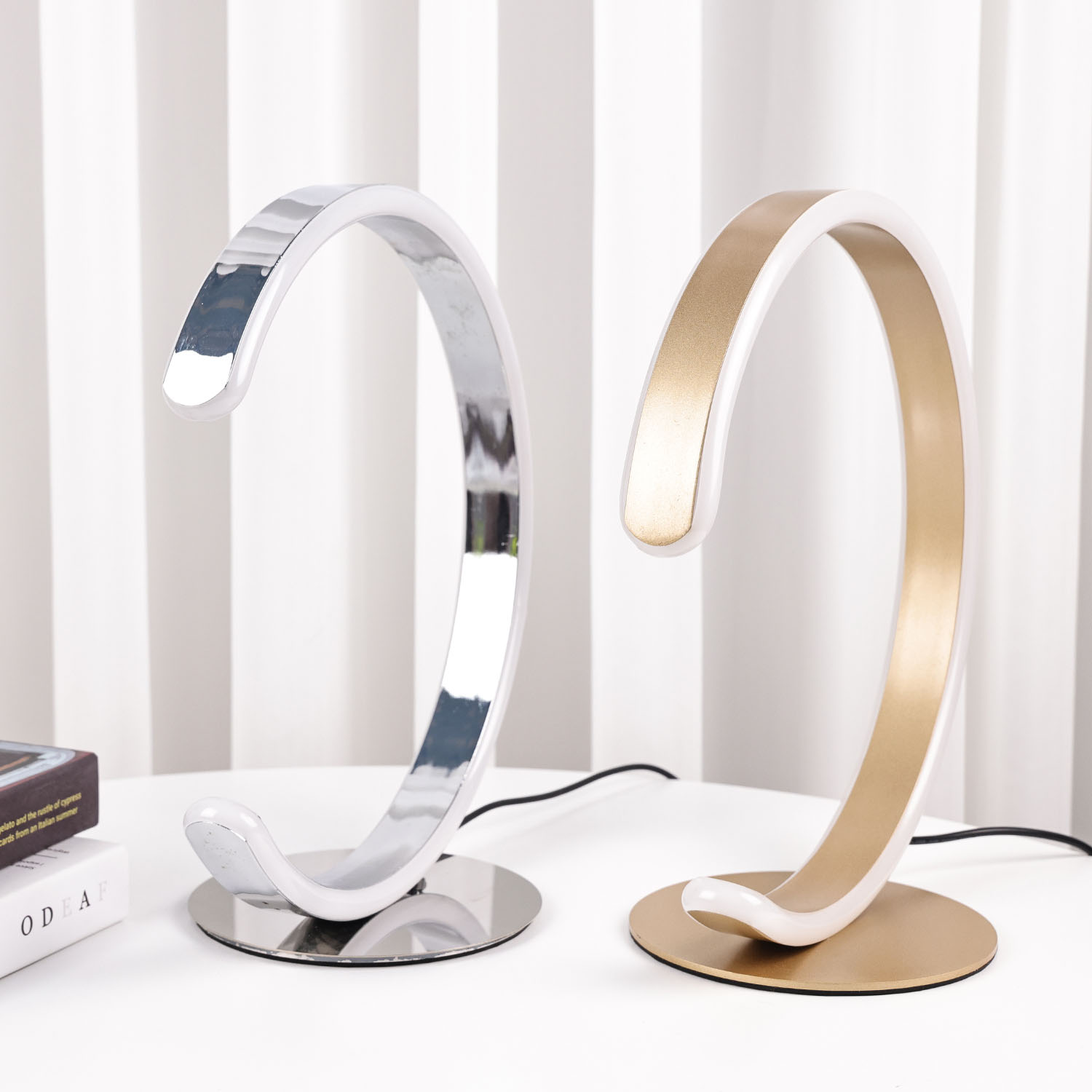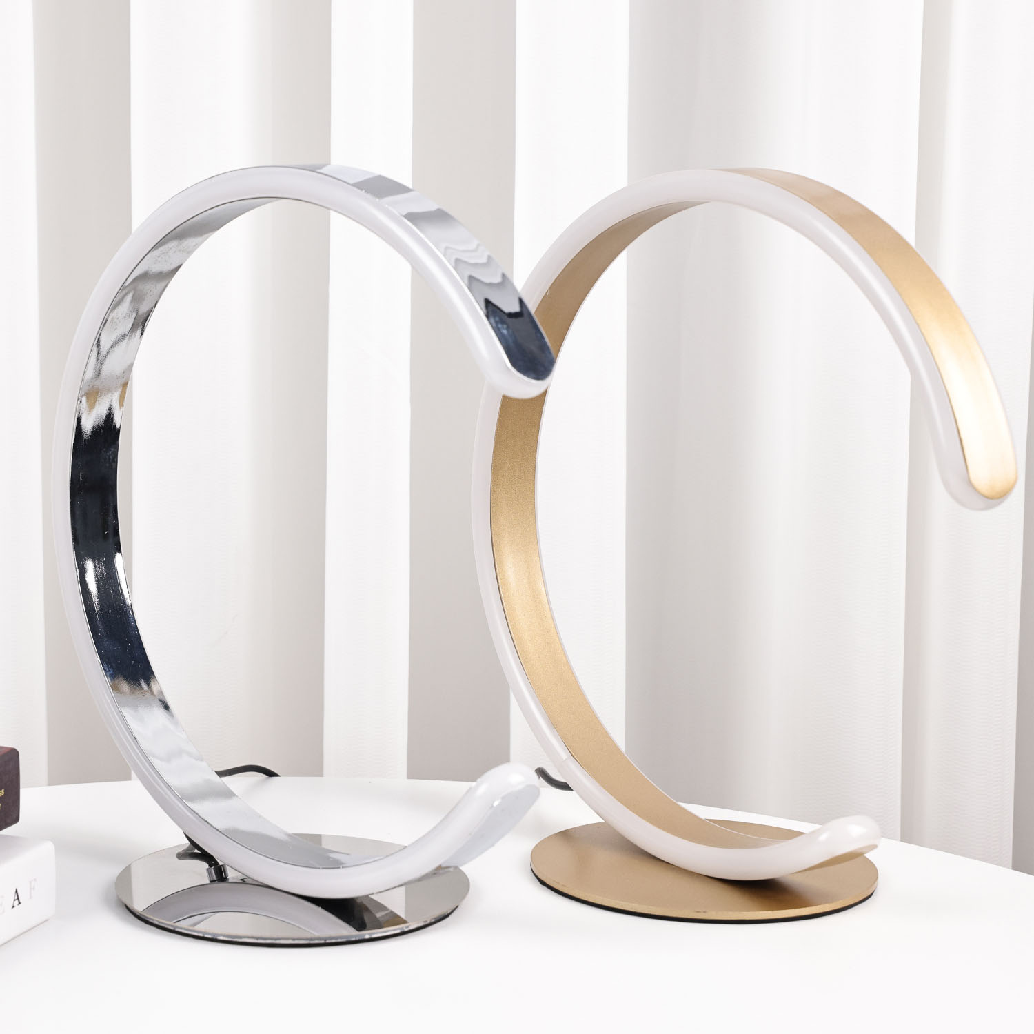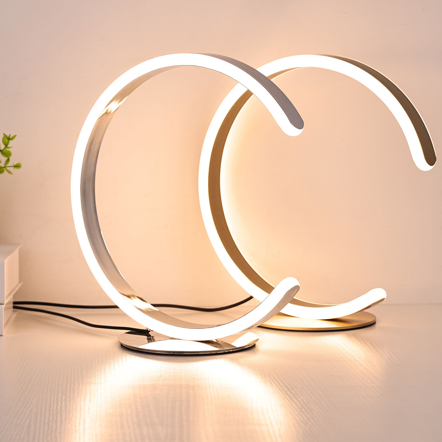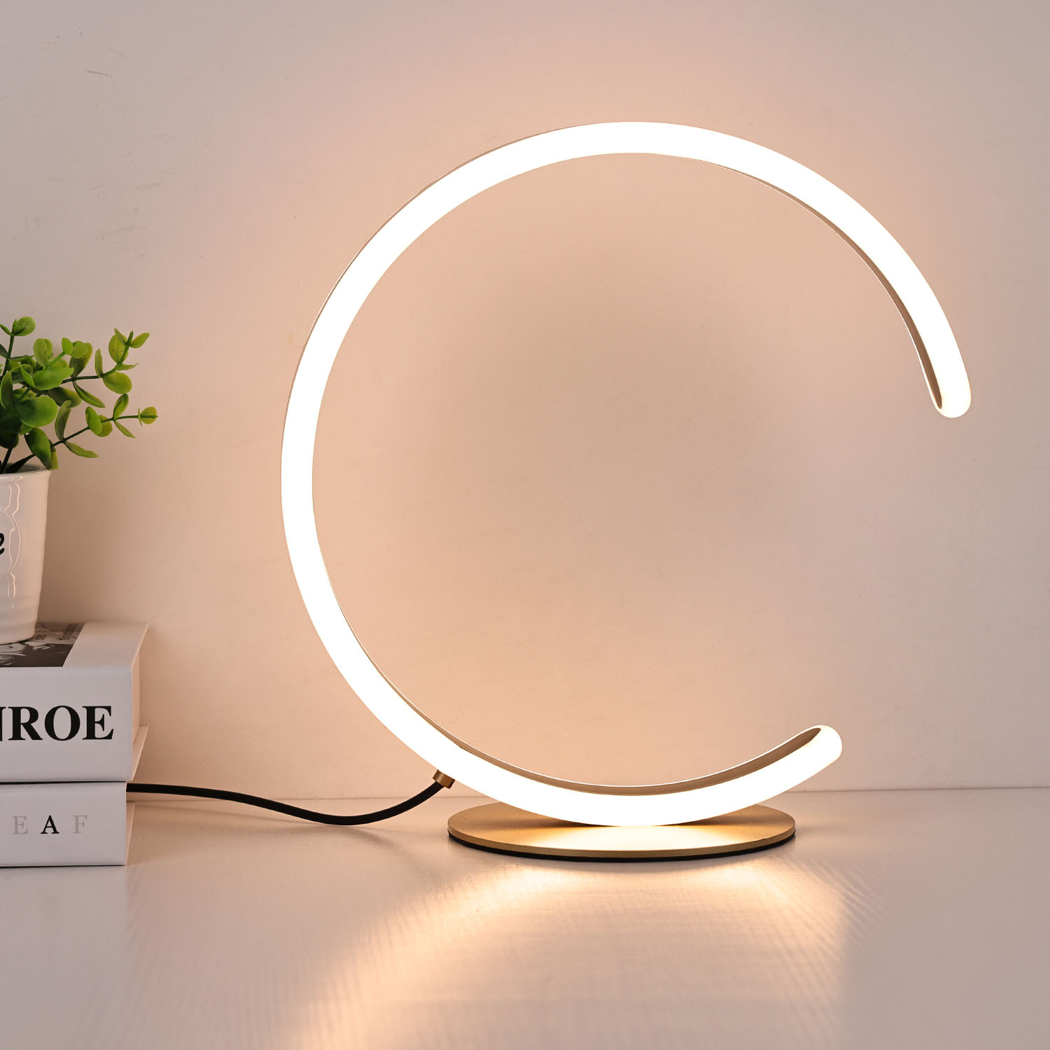 Namizna svetilka C Shade Led. Namizna svetilka temelji na sodobnem in preprostem dizajnu. Okrogla namizna svetilka ima lesen vzorec na zunanji strani in LED osvetlitev na notranjem obroču. Ker je zunanjost izdelana iz lesa in notranjost iz plastike, je teža namizne svetilke zelo lahka in enostavna za prenašanje