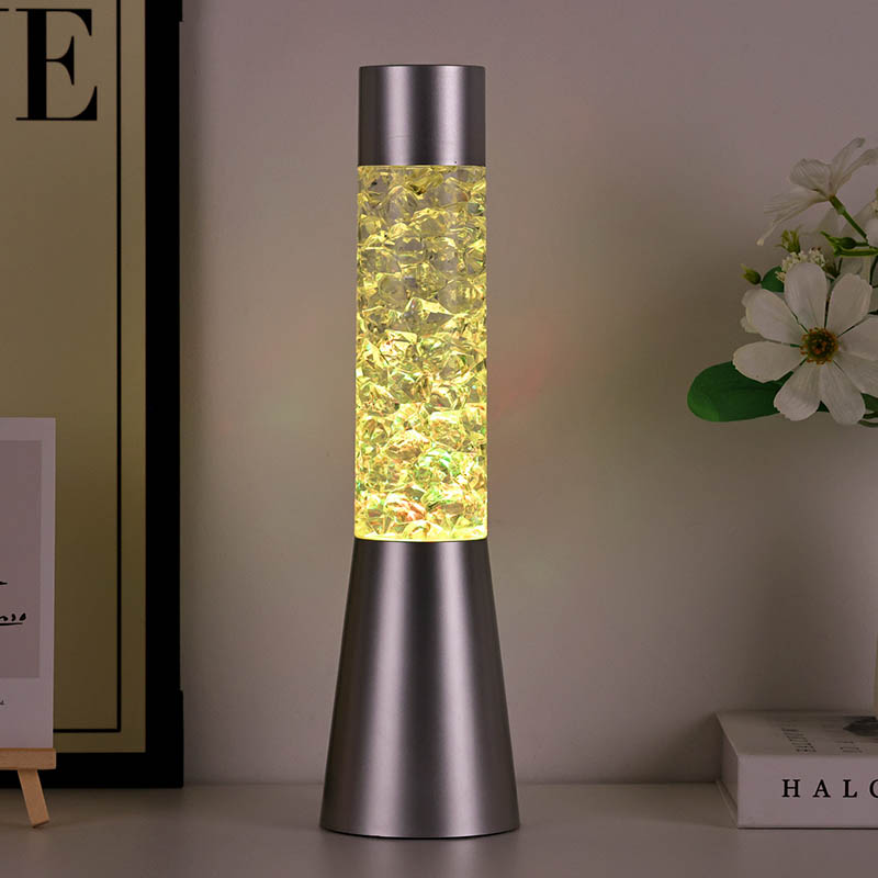 Nočna svetilka s tekočimi bleščicami, ki spreminjajo barvo, ima elegantno in sodobno obliko s kovinskim podstavkom in prozornim zgornjim delom, napolnjenim z barvitimi, kristalom podobnimi deli. Podstavek svetilke je zasnovan tako, da je stabilen in eleganten ter dopolnjuje vsak stil dekoracije doma. V prozornem delu so pisani deli, ki se nežno premikajo in ustvarjajo očarljiv vizualni učinek. Svetilka je na voljo v treh različnih barvnih različicah – rdeči, modri in zeleni – kar vam omogoča, da izberete popoln odtenek, ki se ujema z vašim notranjim dekorjem.