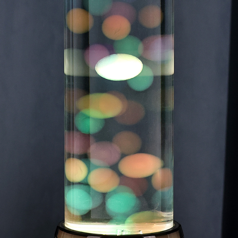 Visoka, elegantna cilindrična oblika svetilke daje sodoben, minimalističen videz, ki dopolnjuje različne notranje stile. Njegovo prozorno ohišje omogoča popolno vidljivost notranjih elementov, vključno z lebdečo meduzo in lesketajočimi svetlobnimi odsevi. Tekočina v notranjosti je posebej oblikovana za simulacijo vodnega toka, kar povečuje realističnost lebdečega gibanja. Ko LED diode spreminjajo barve, se zdi, da meduze utripajo od življenja, kar prizoru doda globino in gibanje.