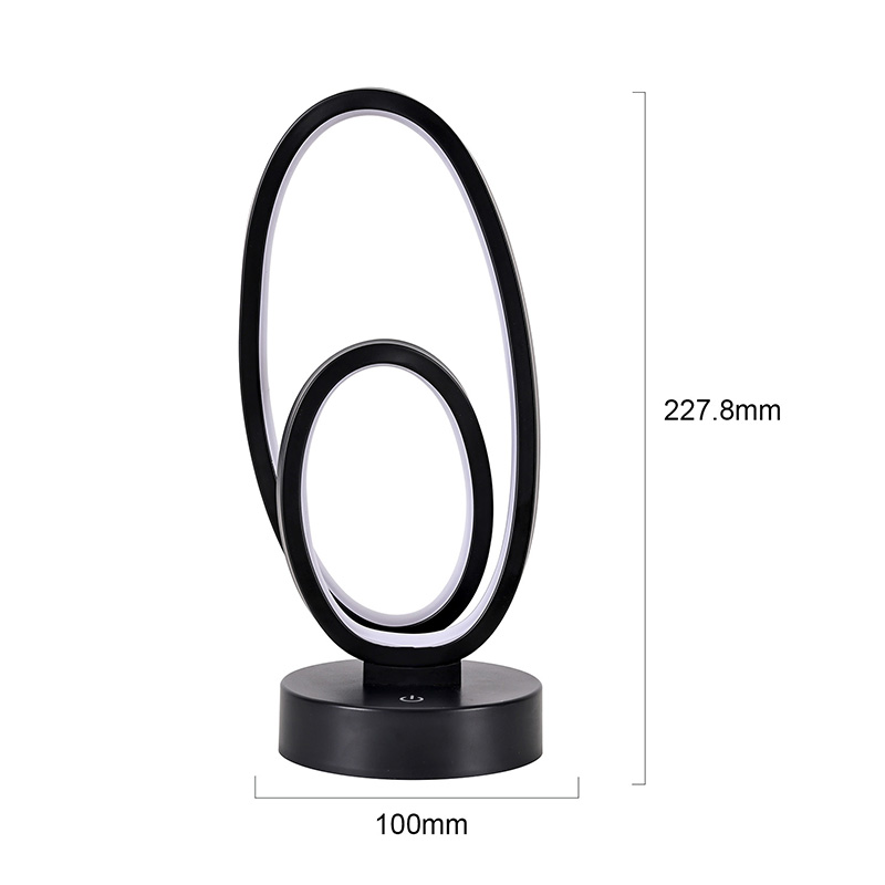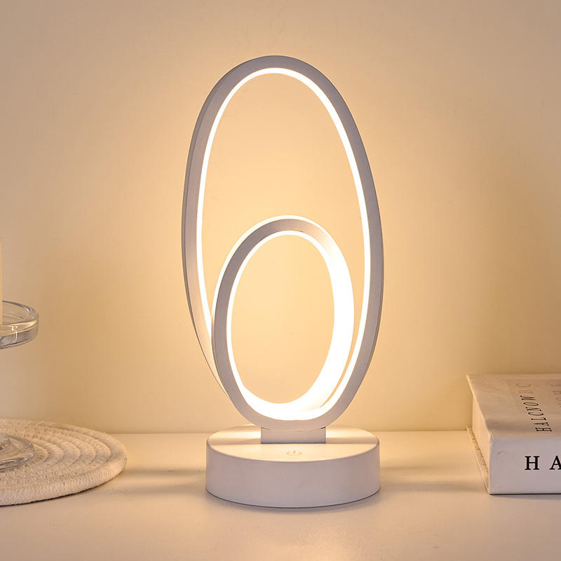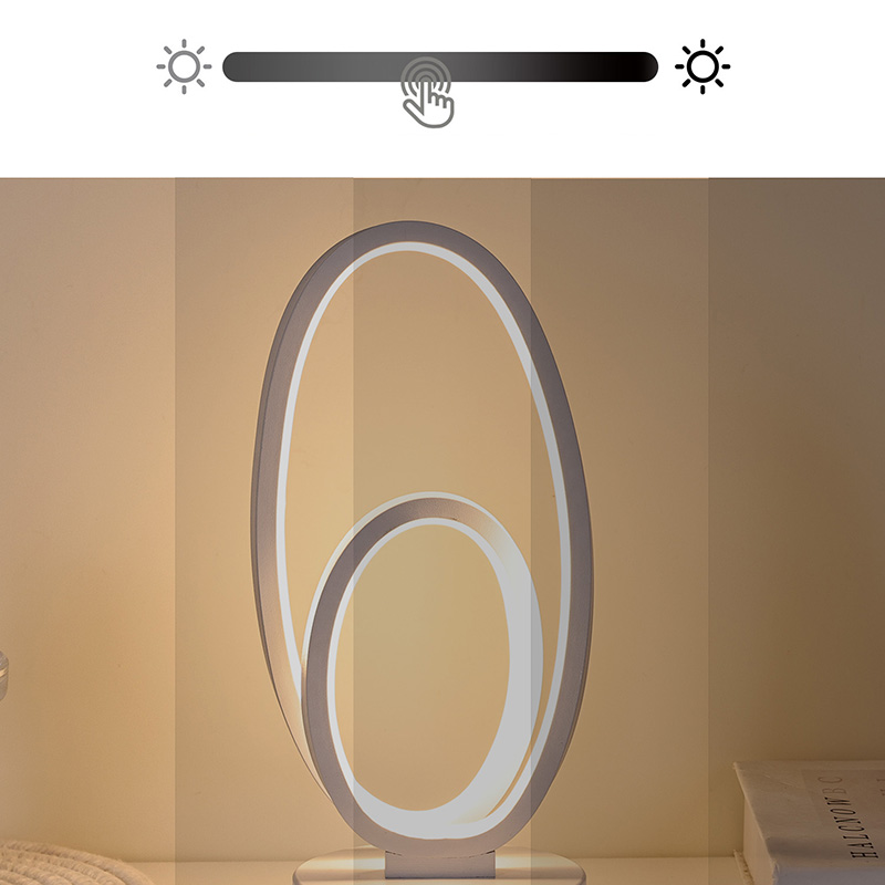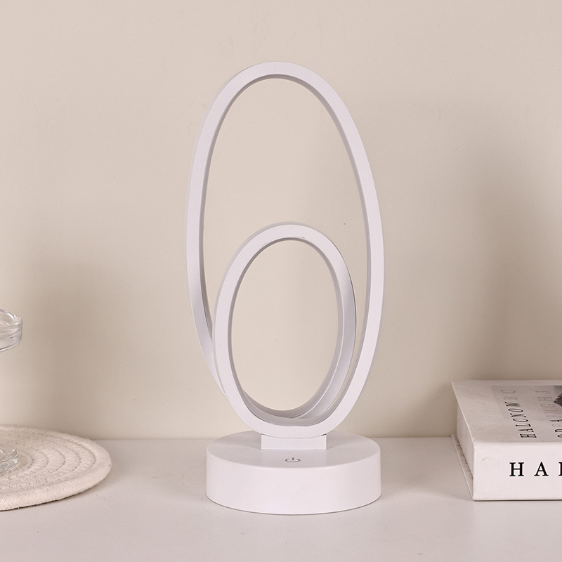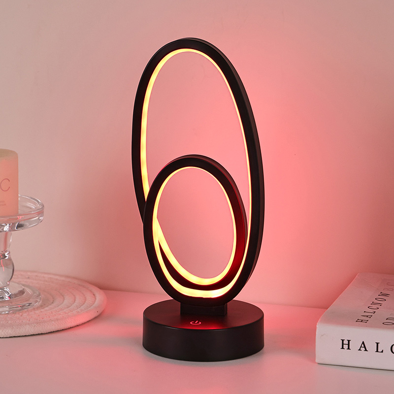 44*33*V23,5 cmRGB namizna svetilka z dvojnim krožnim obročem ima zasnovo z dvojnim obročem z elegantnimi obrisi, začrtanimi z minimalističnimi linijami. Kombinacija kovine in visokokakovostne plastike se ponaša z izjemno teksturo in nežnim dotikom. Poleg tega, da je orodje za razsvetljavo, je