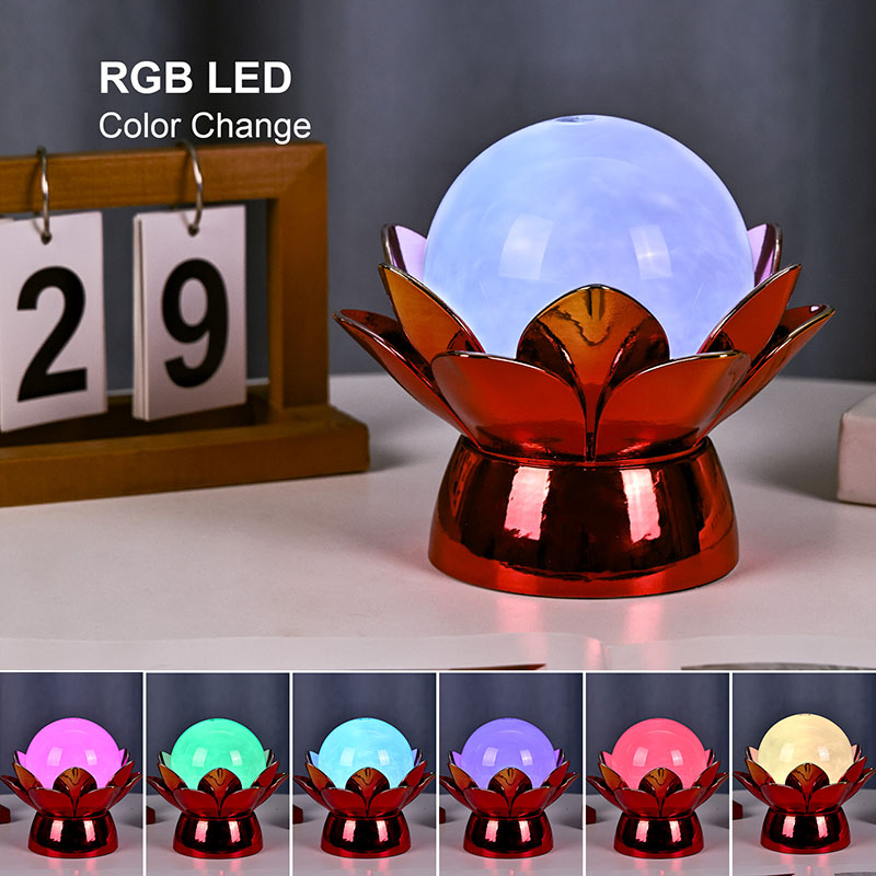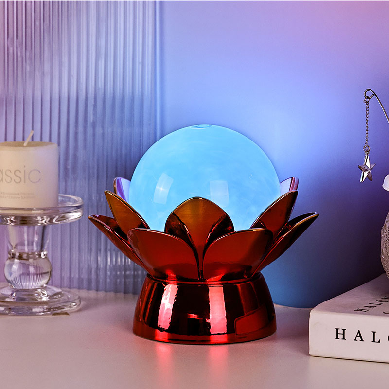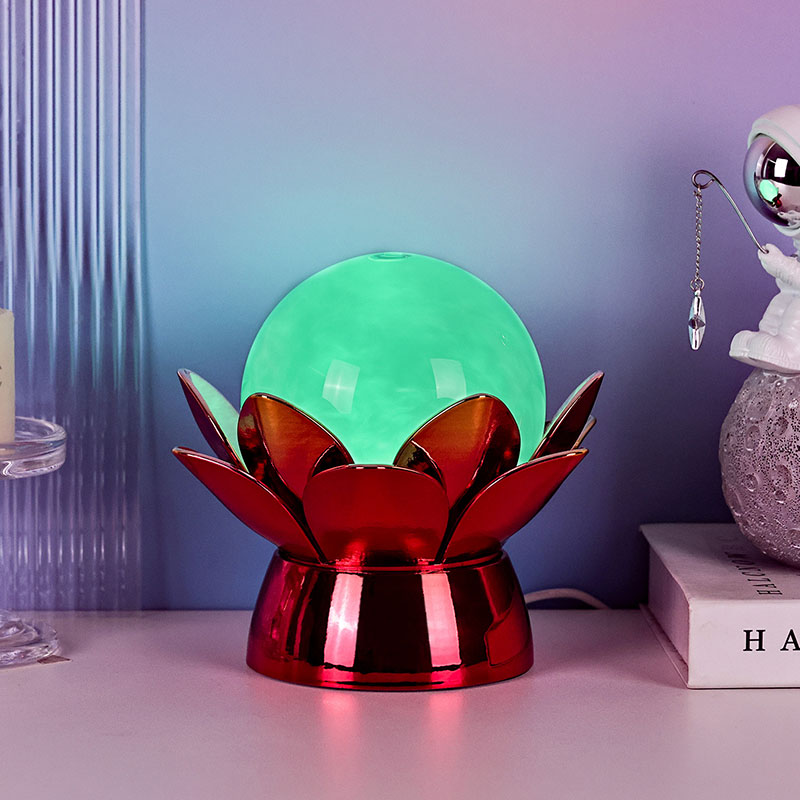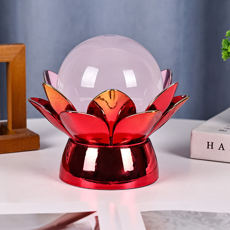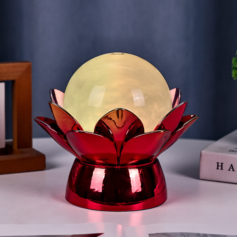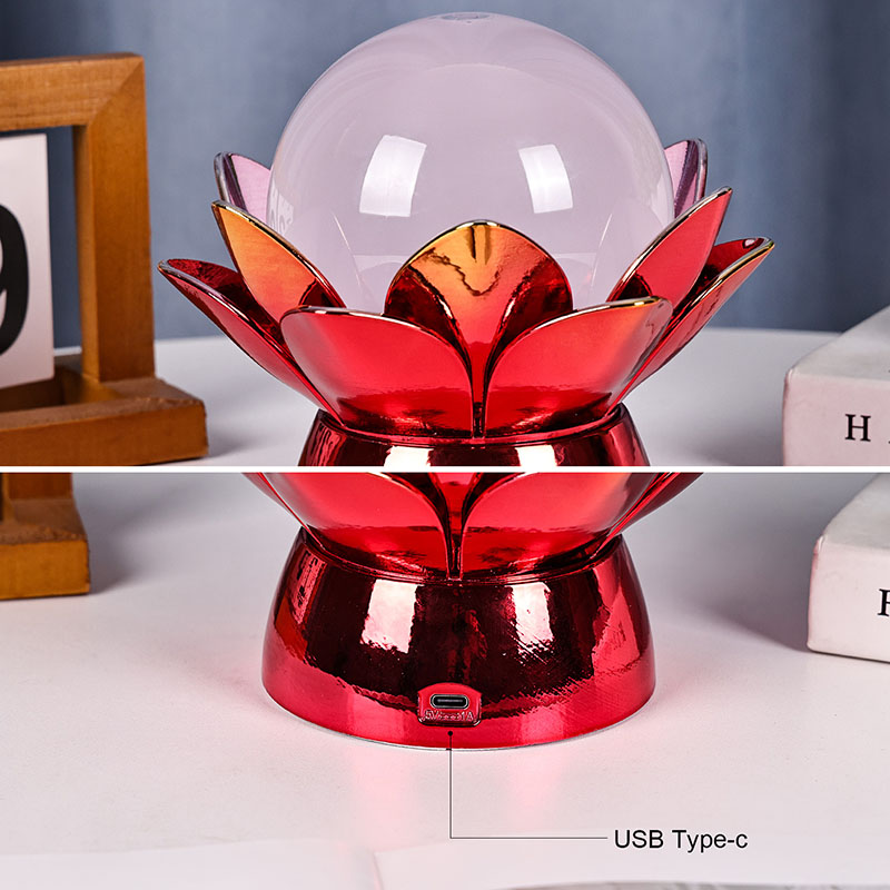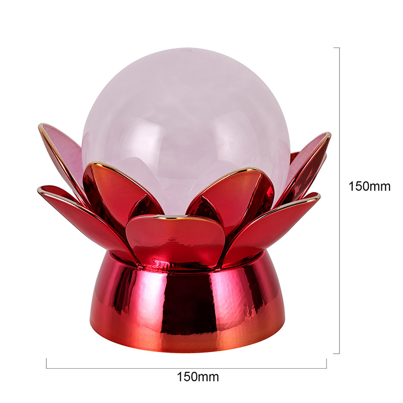 Podnožje, izdelano iz visokokakovostnih materialov, je izdelano iz polirane kovine z osupljivim rdeče-zlatim zaključkom, ki lepo odbija svetlobo in dodaja globino in bogastvo njegovemu videzu. Oblika lotosa ne služi le kot estetska osrednja točka, ampak nosi tudi simboličen pomen, ki izvira iz vzhodnih tradicij – predstavlja razsvetljenje, odpornost in harmonijo. Odsevna površina poveča vizualni učinek, zaradi česar svetilka sveti tudi v okoljih s šibko svetlobo.