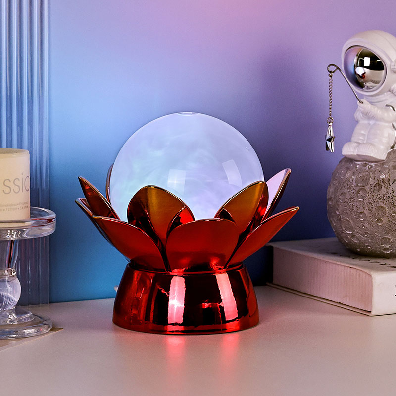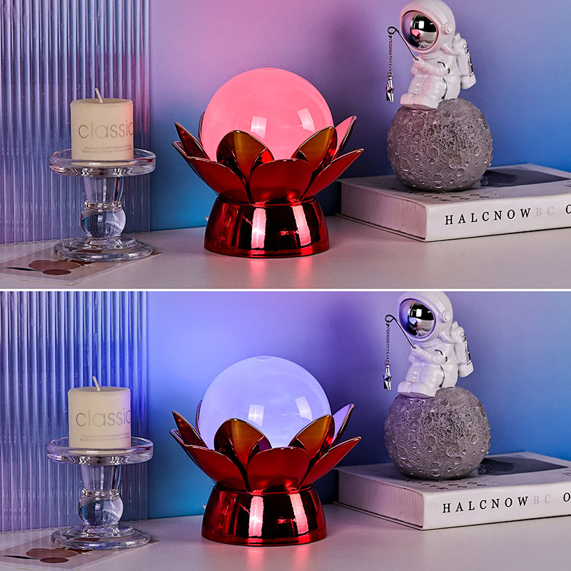 Očarljiva nočna lučka Lotus Cloud Globe – očarljiva fuzija dizajna, ki ga navdihuje narava, pomirjujočega ambienta in sodobne tehnologije. Ta elegantna okrasna svetilka ima prosojno stekleno kroglo, napolnjeno s posebno tekočino, ki simulira plavajoče oblake in ustvarja miren, eteričen učinek, ko se nežno vrtinči in pretaka. Ta nočna lučka, navdihnjena s svetim lotosovim cvetom, počiva na čudovito oblikovani kovinski podlagi v obliki cvetočih lotosovih listov, ki simbolizirajo čistost, mir in duhovno prebujenje.