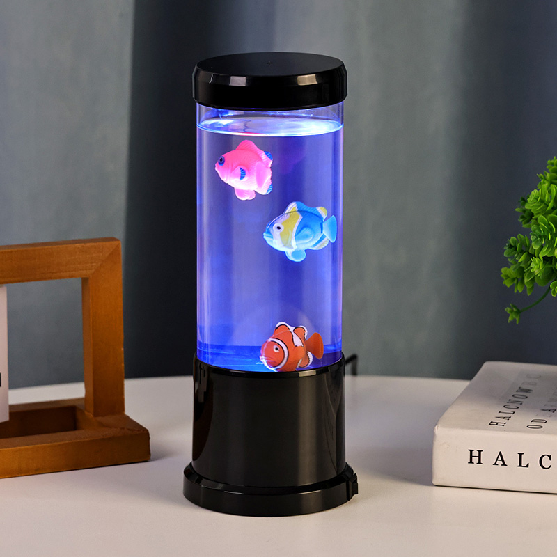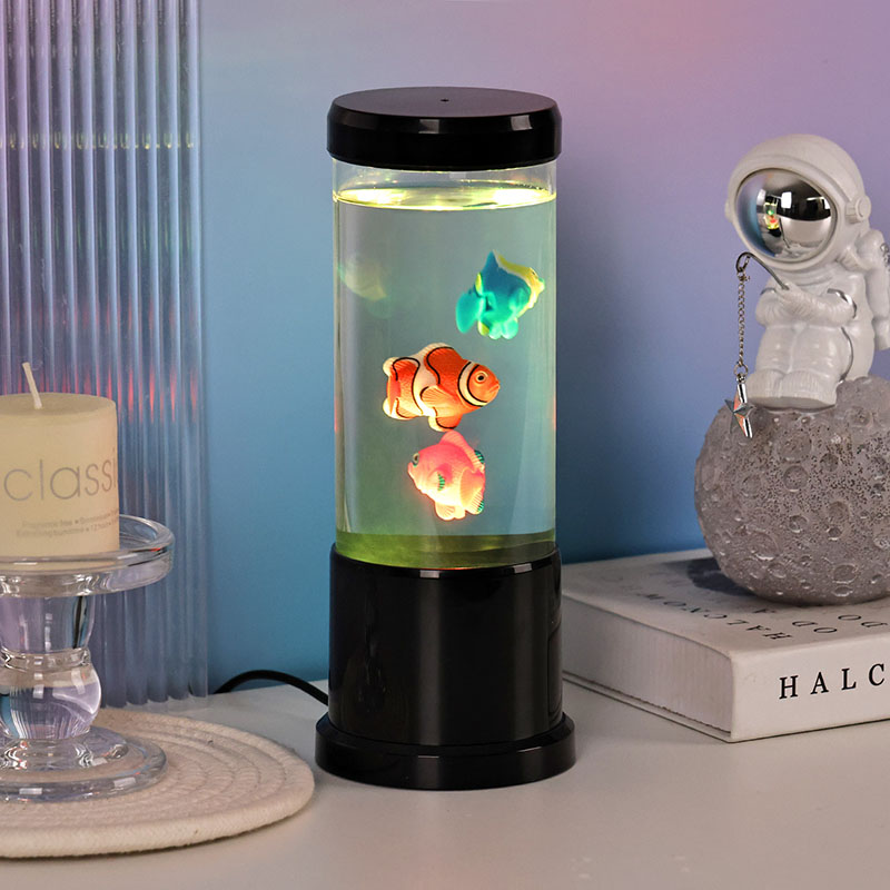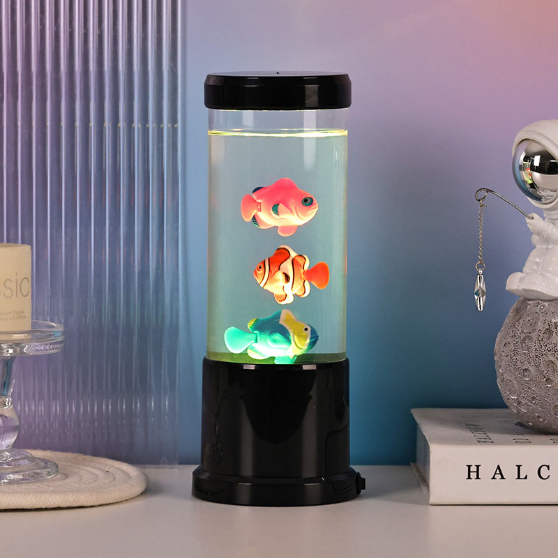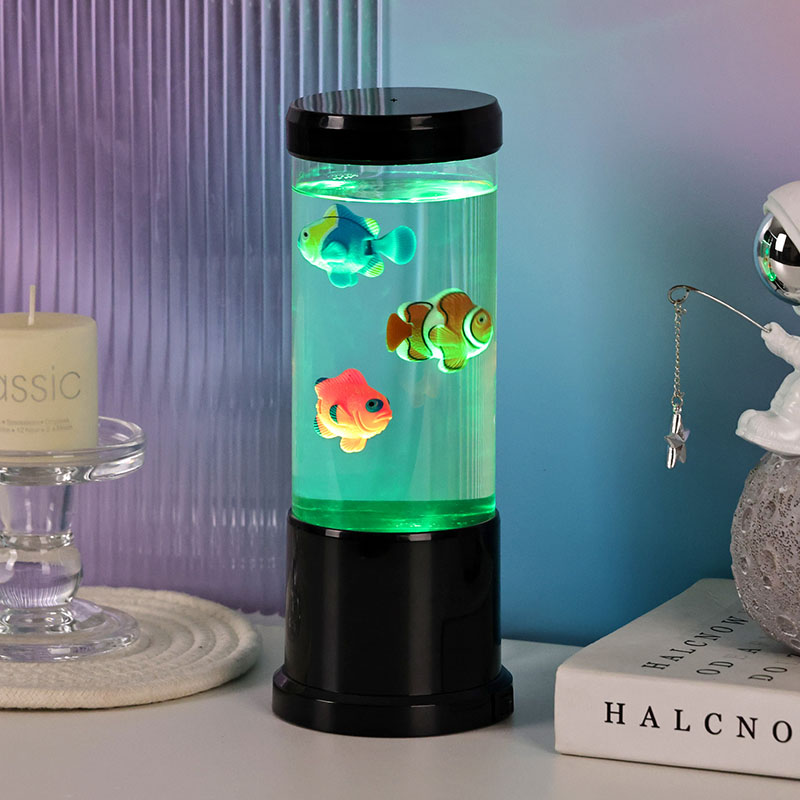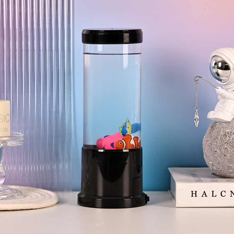 Predstavljamo vam očarljivo LED svetilko za ribe – osupljivo mešanico sodobnega dizajna in vodnega šarma, ki v vaš dom prinese čarobnost podvodnega sveta. S svojo elegantno črno zunanjostjo, elegantno cilindrično obliko in očarljivim notranjim gibanjem je ta okrasna svetilka več kot le osvetlitev –