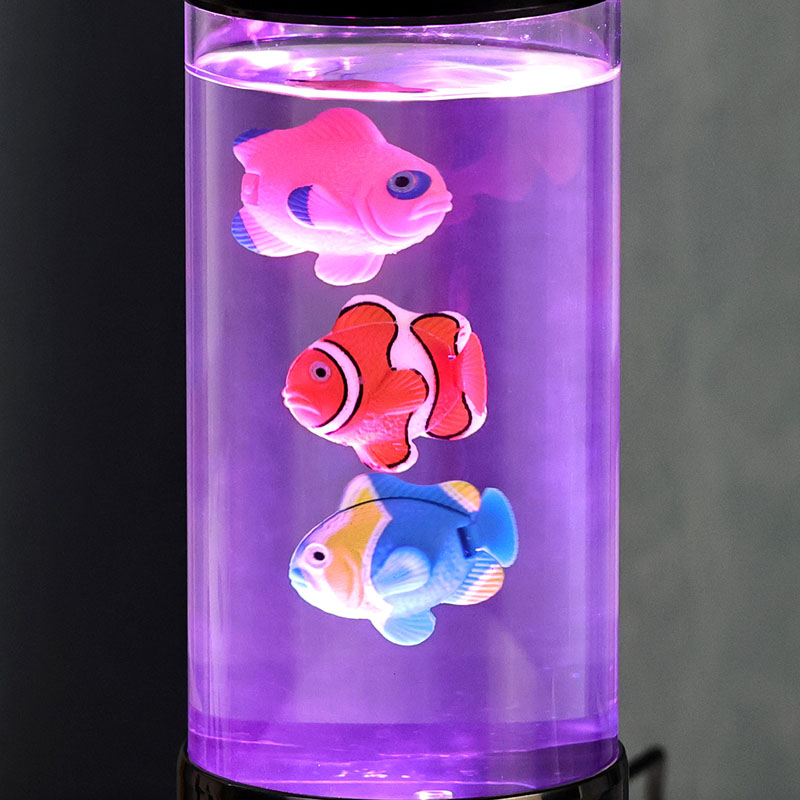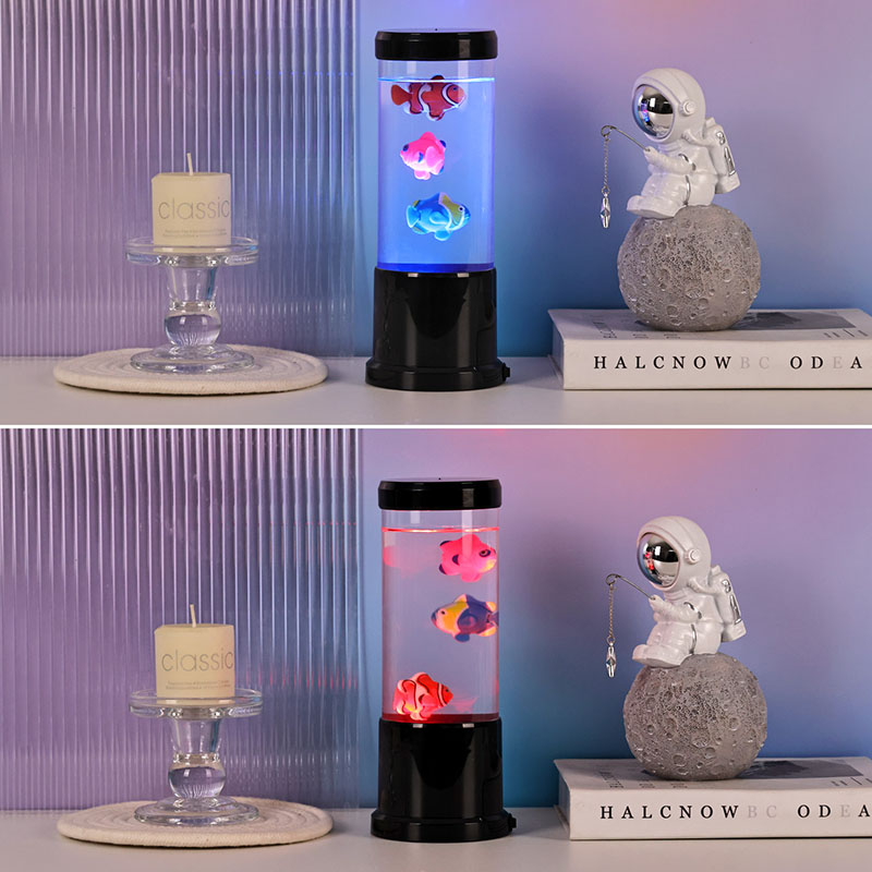Znotraj prozornega rezervoarja resnične umetne ribe graciozno drsijo gor in dol v sinhronizaciji z nežnimi curki mehurčkov, ki se dvigajo z dna. Te ribe s čudovitimi podrobnostmi, oblikovane z živimi barvami in realističnimi teksturami, se zdijo, kot da plavajo naravno, saj jih nosi mehak tok, ki ga ustvarja vgrajena zračna črpalka. Gibanje je pomirjujoče in hipnotično ter ustvarja pomirjujočo vizualno izkušnjo, ki pomaga zmanjšati stres in spodbuja sprostitev.