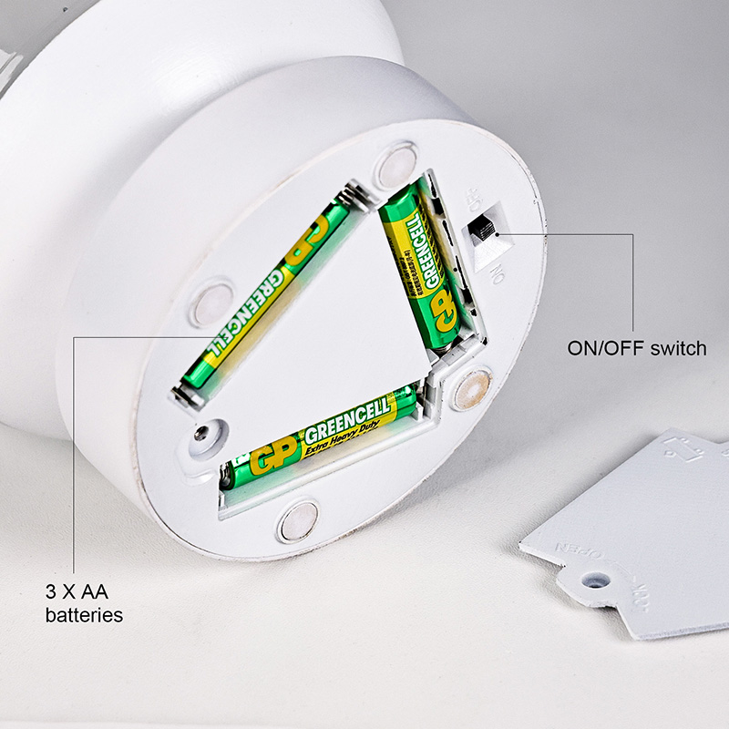Ni potrebe po priklopu; napajajo ga lahko samo 3 AAA baterije, odlikuje pa ga preprosta namestitev in prilagodljiva uporaba. Naj bo postavljen na nočno omarico, mizo, otroško posteljico ali na kampiranje
