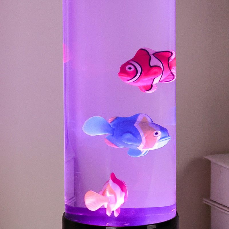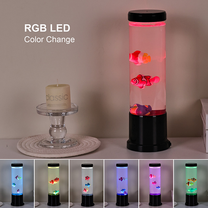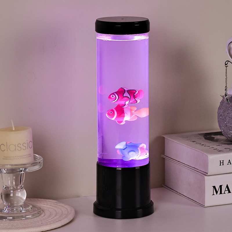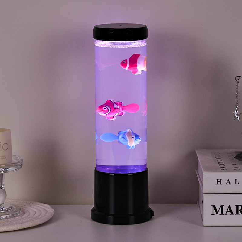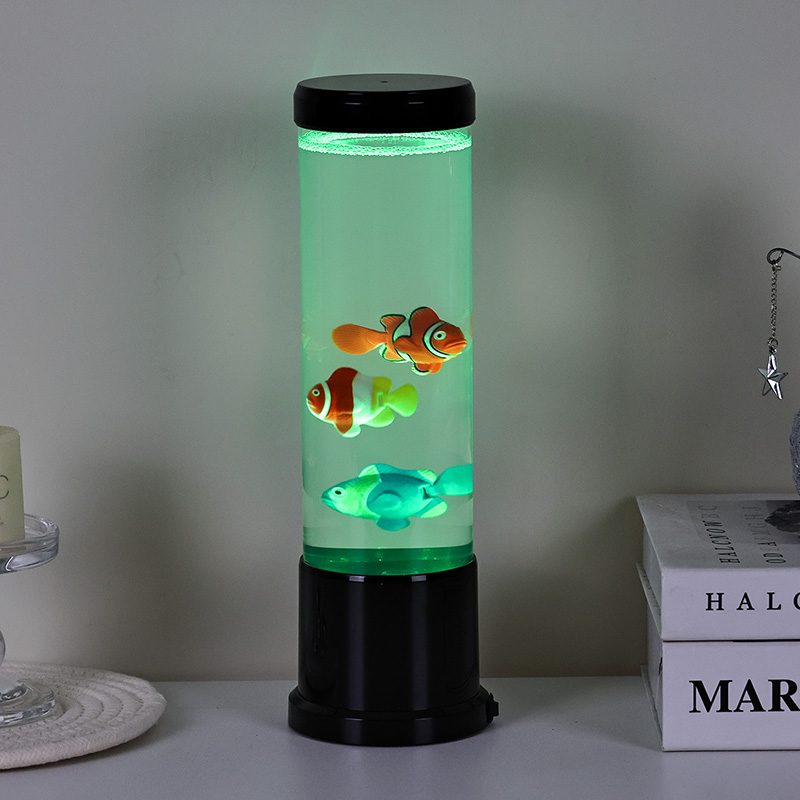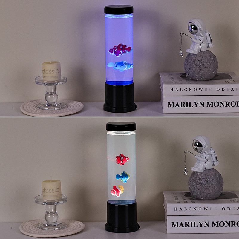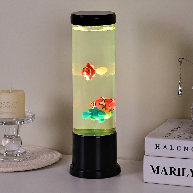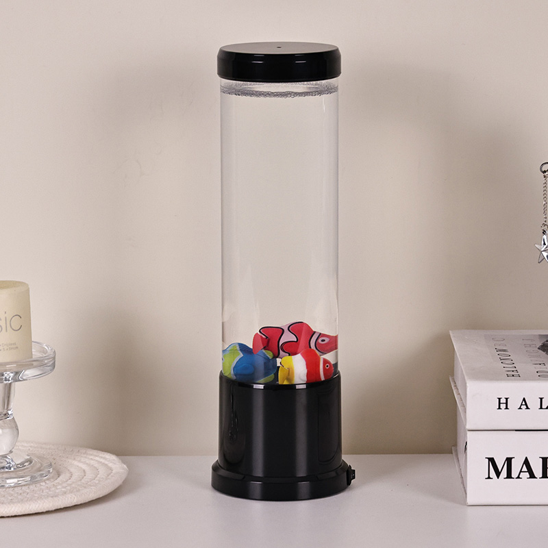 Srce te svetilke je skrbno izdelana simulacija pravega akvarija. Znotraj prozornega stolpca boste našli čudovite podrobne lebdeče figure rib – kot so živahne klovnske ribe in druge tropske vrste –, ki se nežno premikajo in plavajo skozi vodi podobno tekočino. Dodatek svetleče meduze poveča čarobno podvodno iluzijo, ki nežno utripa z eterično svetlobo. Kombinacija gibanja in barve ustvari dinamično sceno, ki pritegne pozornost in v vaše okolje vnese mir.