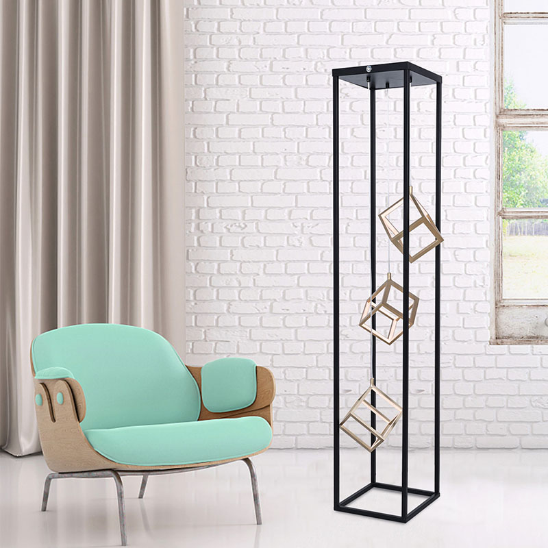 Moderno oblikovane talne svetilke, največja značilnost izdelka je pravokotna oblika okvirja, sestavljena iz kovine, s 3 kvadratnimi LED lestenci v notranjosti. Celoten dizajn lahko uporabite kot dekoracijo v dvorani, na vrhu pa je gumb za nadzor intenzivnosti svetlobe