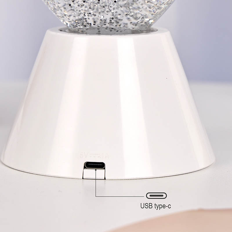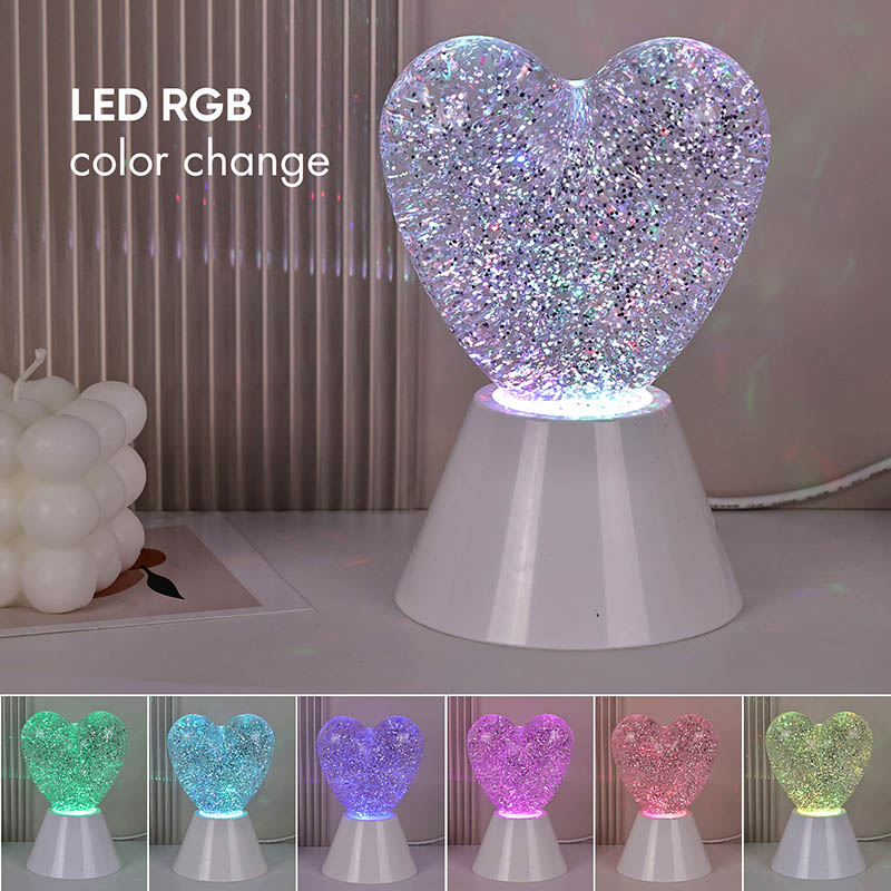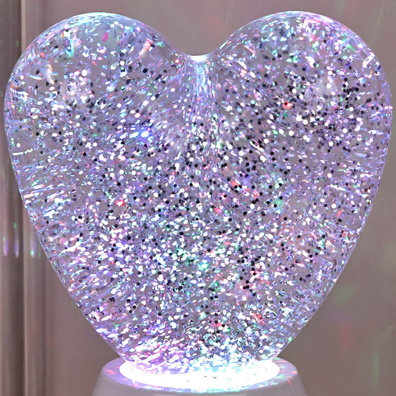 Ena od izstopajočih lastnosti te svetilke je uporaba bleščic znotraj zabojnikov v obliki srca. Ko svetloba spreminja barvo, bleščice znotraj vsebnika ustvarja čudovit, iskriv učinek, ki vašemu prostoru doda kanček magije. Ta edinstven oblikovalski element ne samo da izboljšuje vizualno privlačnost, ampak tudi dodaja igriv in muhast dotik vašemu dekorju.