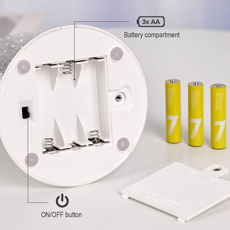 Svetilka je zasnovana z belo plastično podlago, ki zagotavlja stabilnost in eleganten, sodoben videz. V tem baznem je vir napajanja svetilke, ki so lahko tri baterije AAA (niso vključene) ali USB Type-C kabel (vključen). Ta možnost dvojne moči vam ponuja prilagodljivost za uporabo svetilke, kjer koli jo potrebujete, pa naj bo v spalnici, dnevni sobi ali celo kot svetilka nočne omarice.