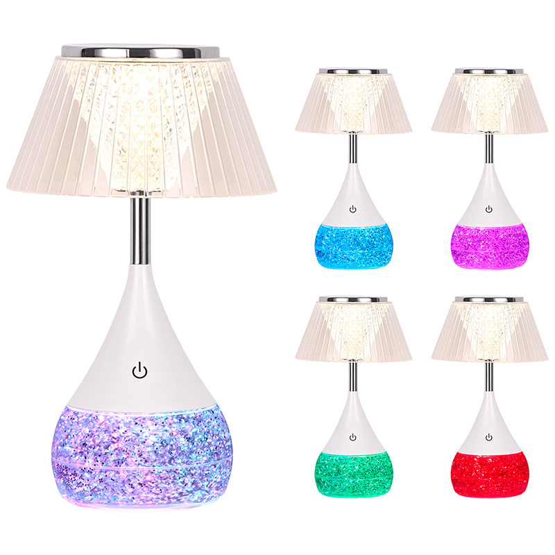 RGB lučka LED namizna svetilka s kristalnim senčnikom. Ta zasnova namizne svetilke je narejena iz plastičnega škatlastega stekla, s poudarkom na ustvarjanju preglednega in razkošnega dizajna. Senčnik je izdelan iz prozornega akrilnega materiala, z linearno zasnovo in prozornim zunanjim pokrovom. Svetloba ima lahko tople barve, sestavo bele svetlobe naravne barvne škatle in različne barve lahko prilagodijo intenzivnost svetlobe, kar bo zelo dobro. Dno je sestavljeno iz tekočine znotraj steklenice, tekoča svetloba pa je lahko sestavljena iz iluzijskih barv RGB.