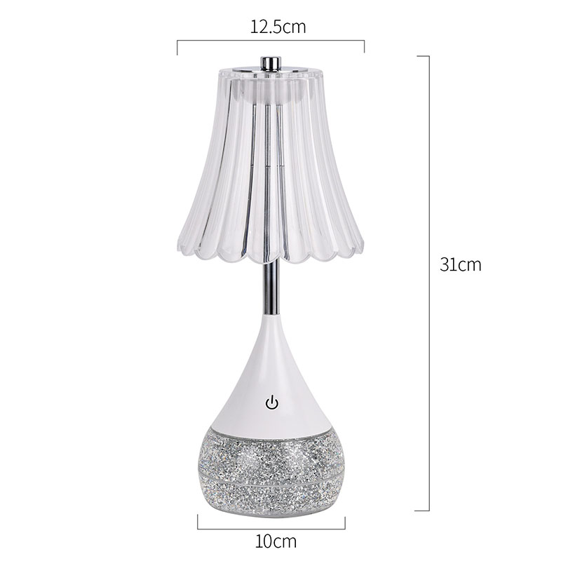 Namizna LED svetilka z brezstopenjsko zatemnitvijo in luksuznim senčnikom. Ta zasnova namizne svetilke je narejena iz plastičnega steklenega stekla s poudarkom na ustvarjanju preglednega in razkošnega dizajna. Senčnik je izdelan iz prozornega akrilnega materiala, z linearno zasnovo in prozornim zunanjim pokrovom. Svetloba ima lahko tople barve, sestavo bele svetlobe naravne barvne škatle in različne barve lahko prilagodijo intenzivnost svetlobe, kar bo zelo dobro. Dno je sestavljeno iz tekočine znotraj steklenice, tekoča svetloba pa je lahko sestavljena iz iluzijskih barv RGB.