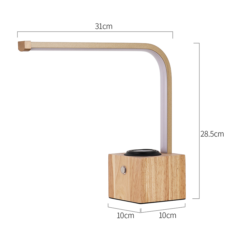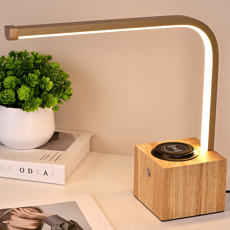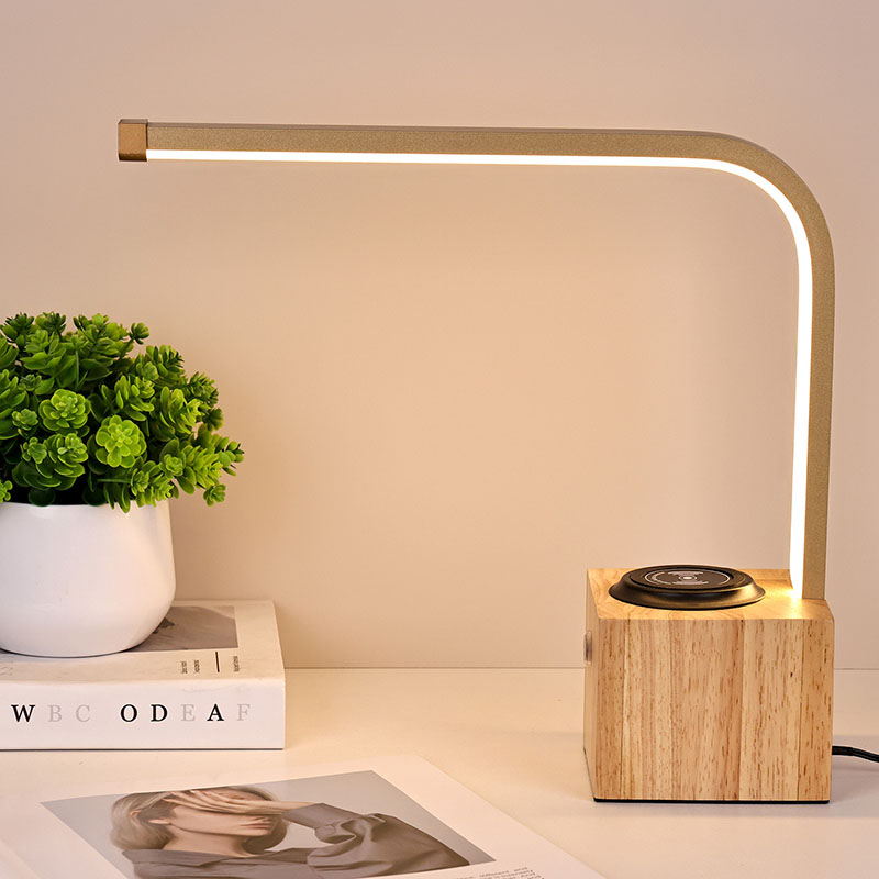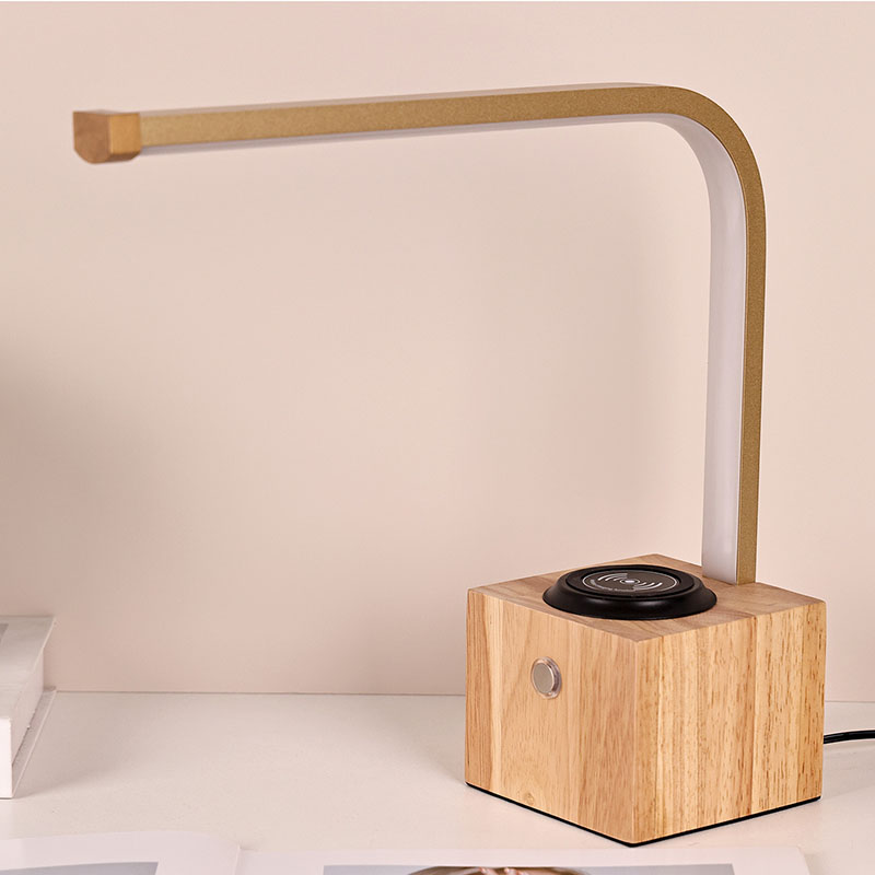 Tradicionalna namizna LED svetilka z lesenim podstavkom z brezžičnim polnilnikom lahko polni telefon z zatemnitvijo na dotik