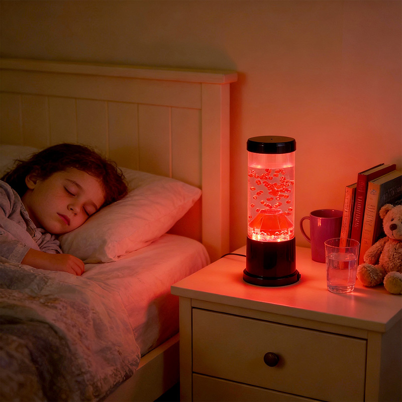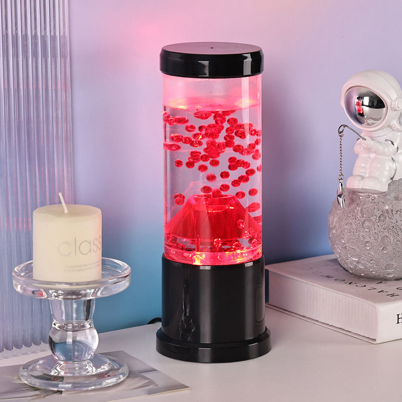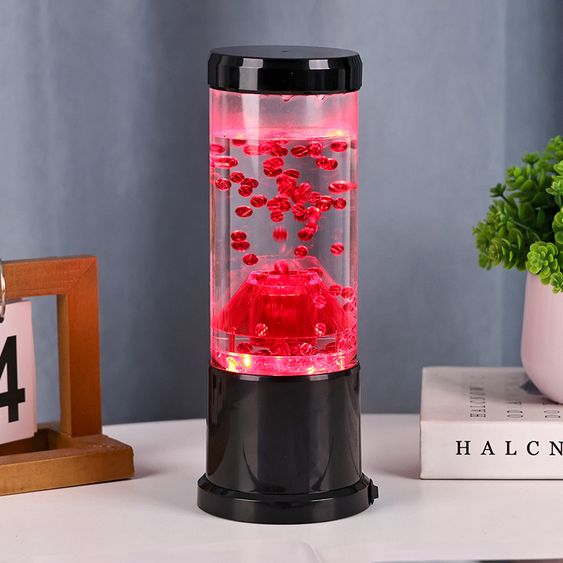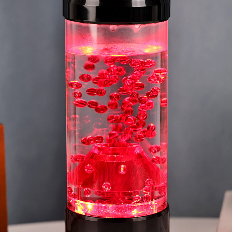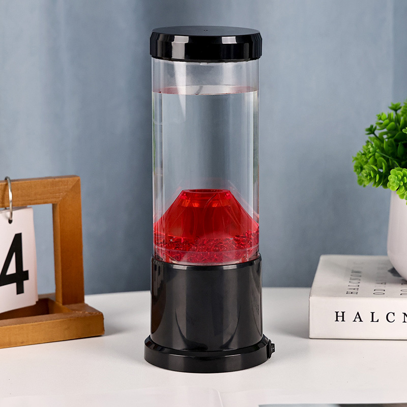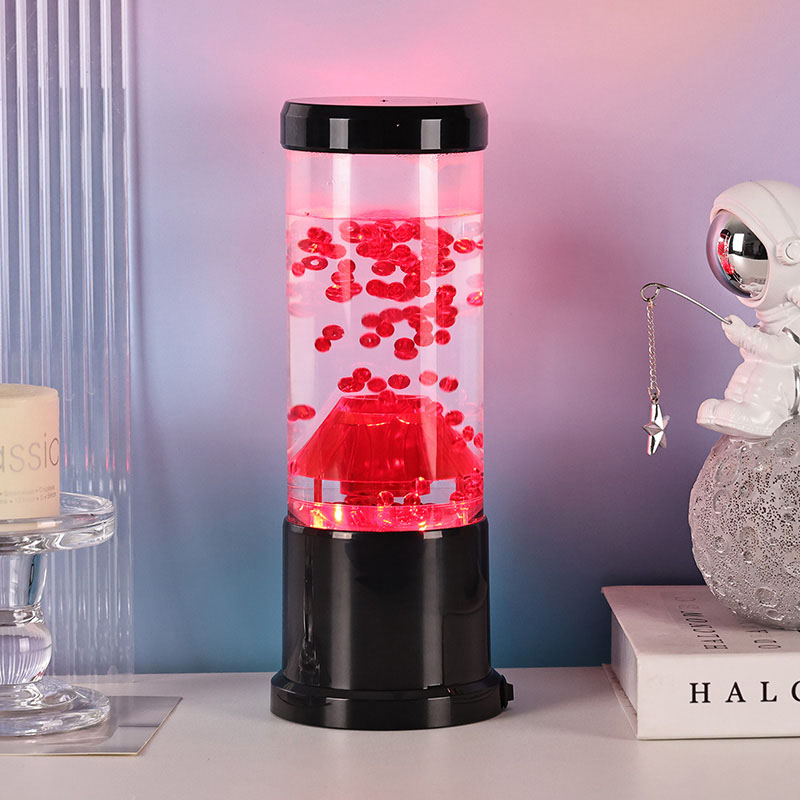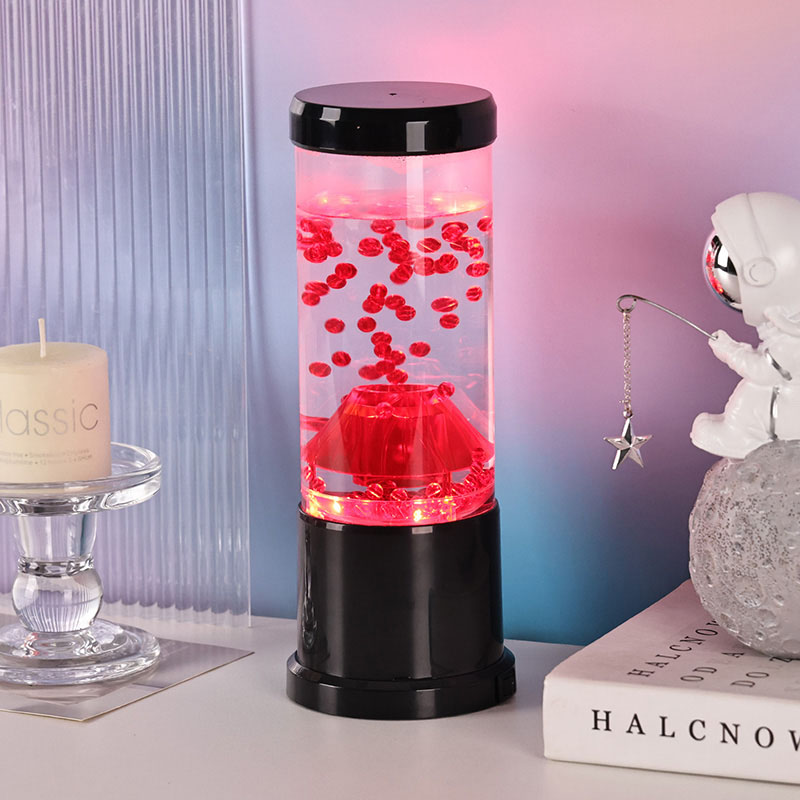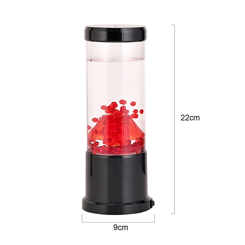 Osrednji del nočne luči je prozoren steber, ki spominja na vulkanski krater. V tem stolpcu boste našli živahen prikaz rdečih krogel, ki spominjajo na staljeno lavo, ki teče znotraj zemeljske skorje. Te krogle elegantno lebdijo v čisti tekočini in ustvarjajo dinamičen in nenehno spreminjajoč se vizualni učinek. Ko svetloba sije skozenj, oddaja topel in vabljiv sij, kot nalašč za ustvarjanje prijetnega vzdušja v kateri koli sobi.