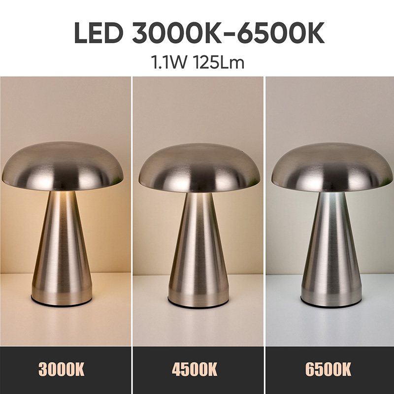 Celotna kovinska namizna svetilka z gobastim senčnikom ima 3000K (topla svetloba) 4500K (naravna svetloba) 6500K (bela svetloba) 3 spremembe barve luči