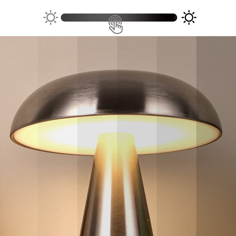 Celotna kovinska namizna svetilka z gobastim senčnikom lahko z zatemnilnikom na dotik nadzoruje svetlost svetlobe